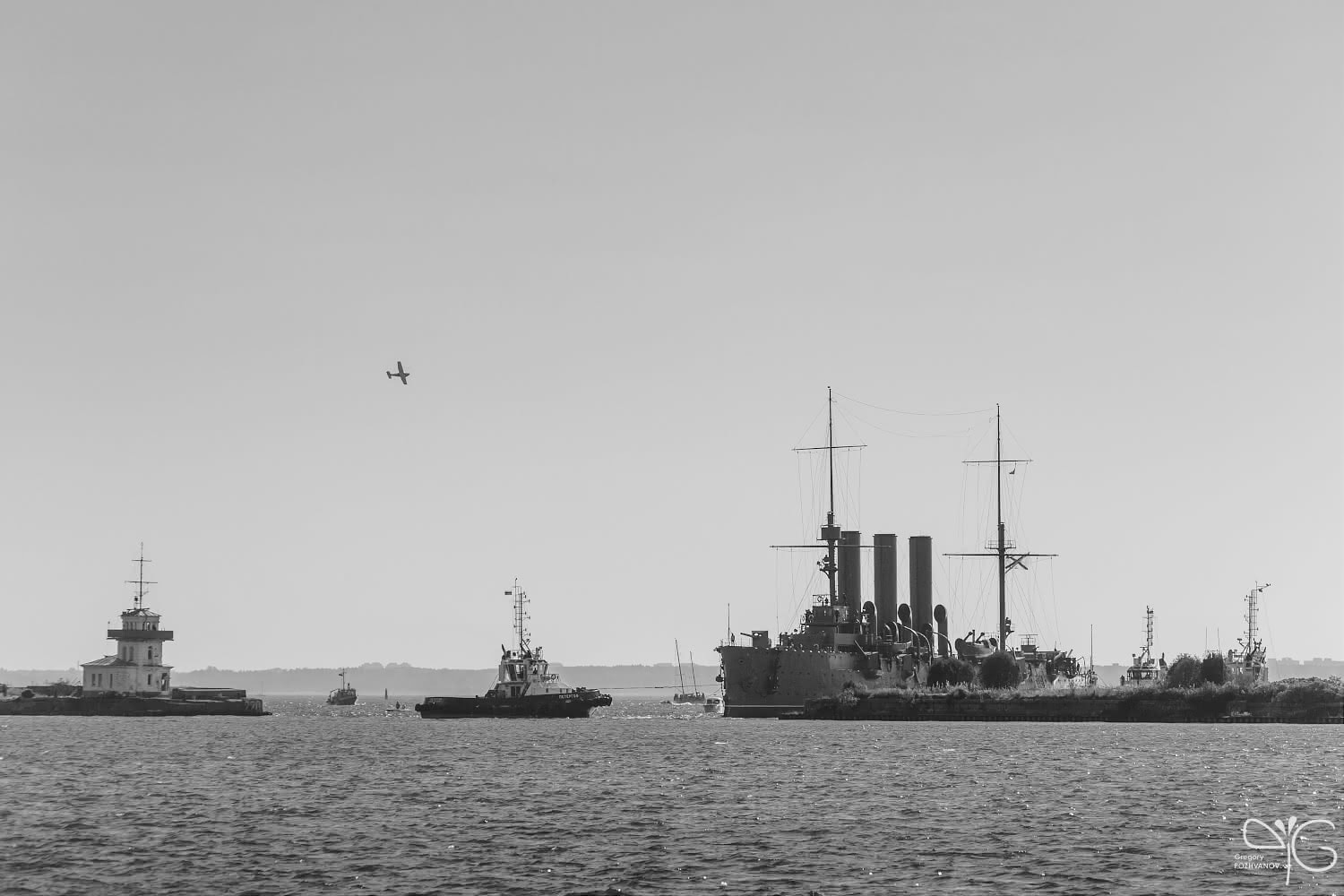 Разворот крейсера Аврора на входе в гавань Кронштадта