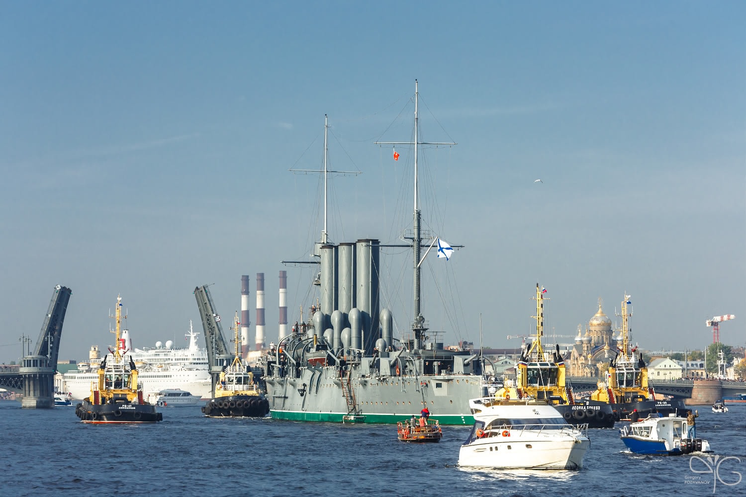 Крейсер Аврора подходит к Благовещенскому мосту (мосту Лейтенанта Шмидта)