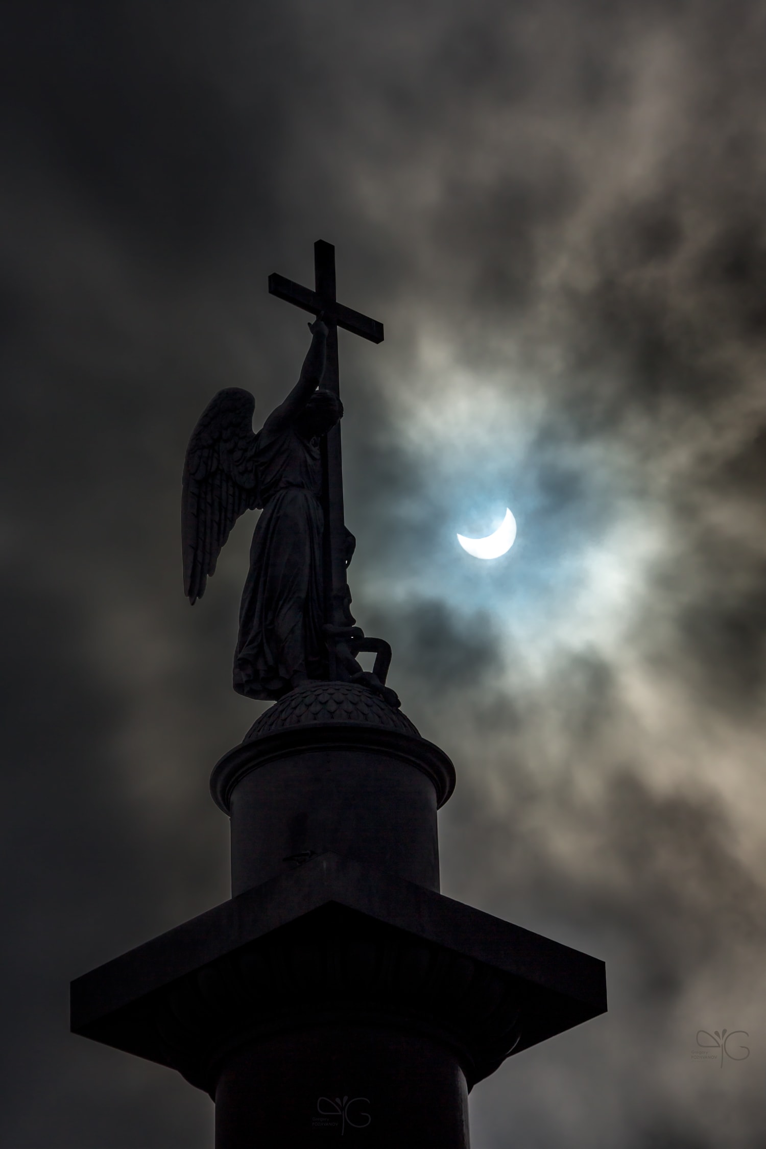 Частичная фаза полного солнечного затмения 20 марта 2015 г., снятая через облачное небо на фоне ангела на Александровской колонне на Дворцовой площади в Санкт-Петербурге | Total Solar Eclipse of March 20th, 2015 (partial phase) photographed behind a dramatic cloudy sky and an angel on top of Alexander Column at Palace Square in Saint-Petersburg, Russia