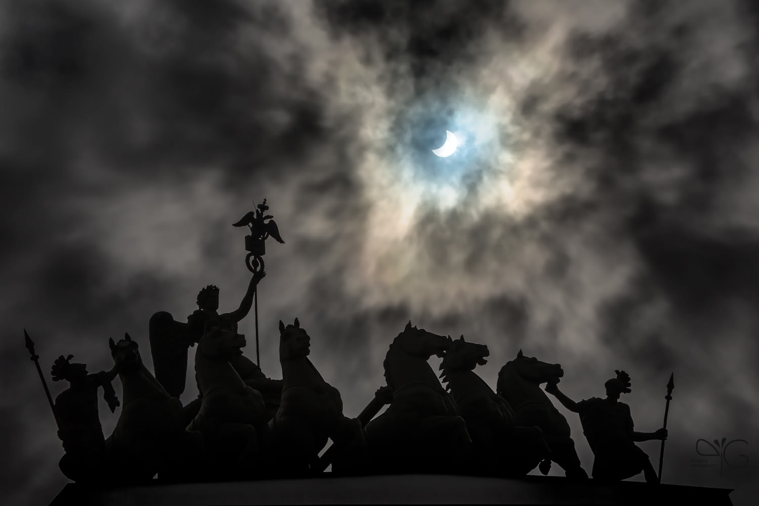 Триумфальная колесница на арке Главного Штаба на Дворцовой площади во время солнечного затмения 20 марта 2015 в Санкт-Петербурге | Total Solar Eclipse of March 20th, 2015 (partial phase) photographed behind a dramatic cloudy sky and a triumphal car on top of General Staff Building at Palace Square in Saint-Petersburg, Russia