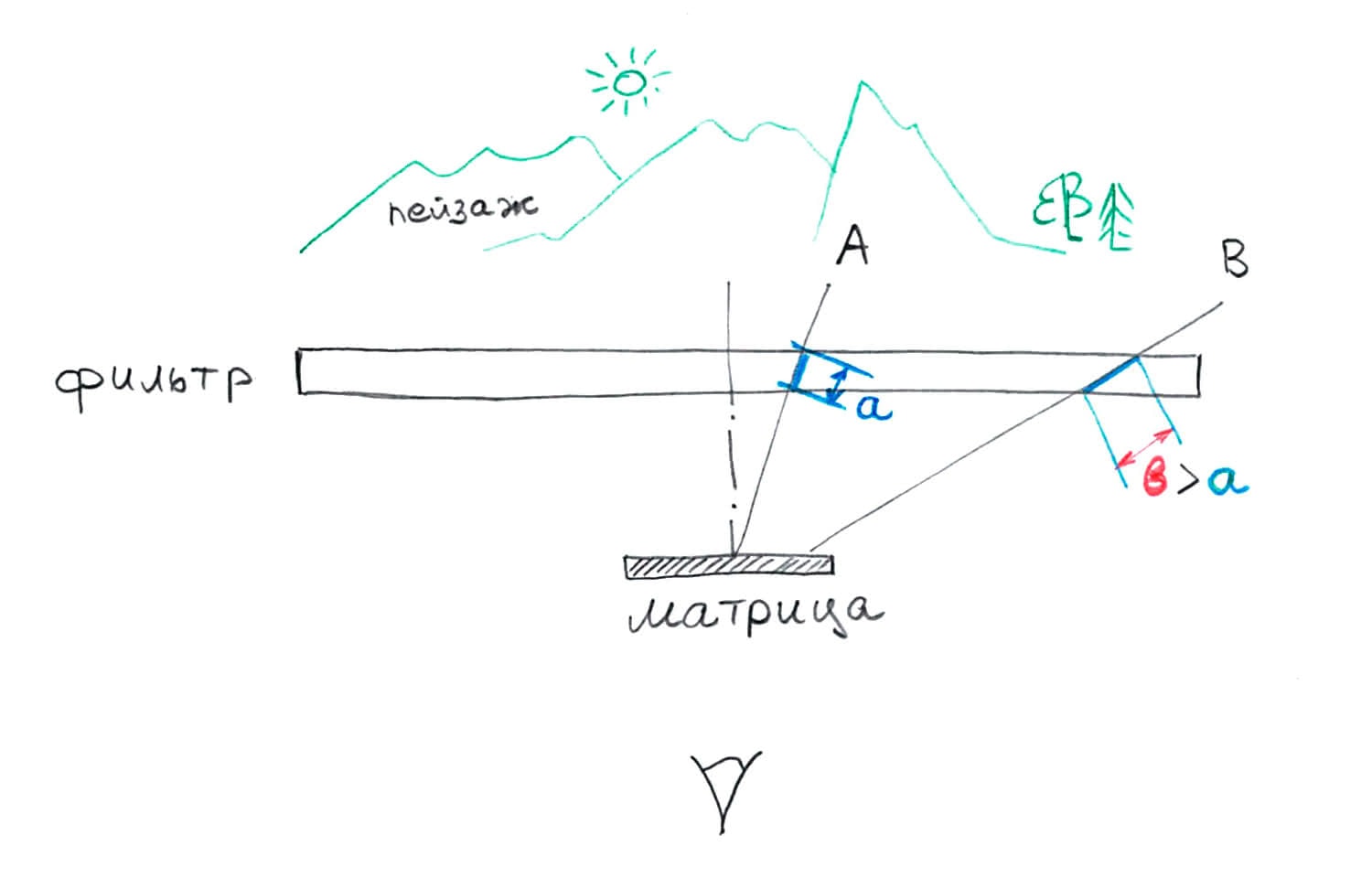 Ход лучей, проходящих нейтрально-серый градиентный фильтр при использовании широкоугольного объектива