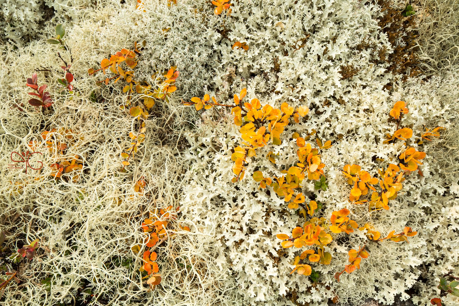 Григорий | Gregory 2015-10-16 Colorful orange dwarf birch leaves among lichens form a carpet in autumn tundra in Hibiny mountains above the Arctic Circle, Russia ← Назад Вперёд →