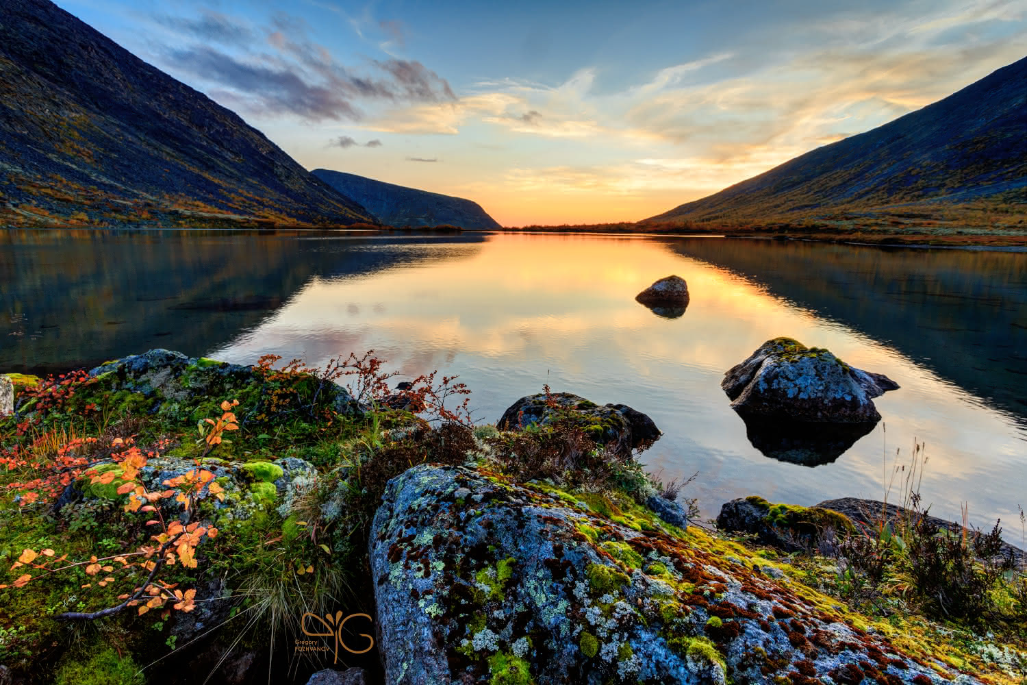 Григорий | Gregory 2015-10-16 Bright sunset clouds and Alyavumchorr mount reflect in still Thatarjavr lake waters in Hibiny, with rocks, pebbles and dwarf birch on the foreground, Kola peninsula above the Arctic Circle, Russia ← Назад Вперёд →