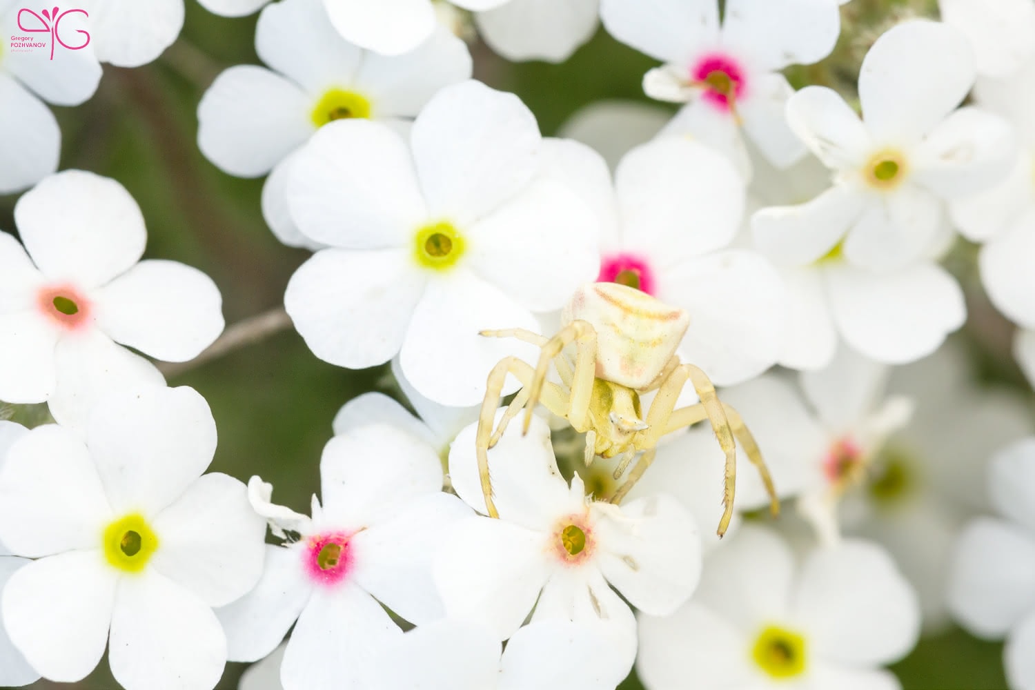 Цветочный паук прячется среди лепестков проломника Козо-Полянского, Androsace Koso-Poljanskii