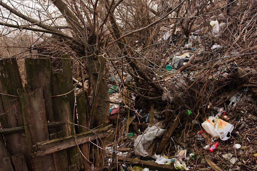 Наткнувшись на этот дом #26 по Рыбацкой, я подумал, что из него уже выгребли всё, подготовив к уничтожению (а какая-то придурковатого вида местная девица, увидев у меня проф. камеру, поинтересовалась, не я ли выкупаю участок под снос). Но нет, пока прошёл вдоль двора, выбирая ракурс, заметил в окне бабулю пенсионерку. Вот, оказывается, этот дом — жилая помойка, через полиэтиленовые пакеты, гниющие бутылки у калитки идёт еле заметная дорожка к крыльцу.