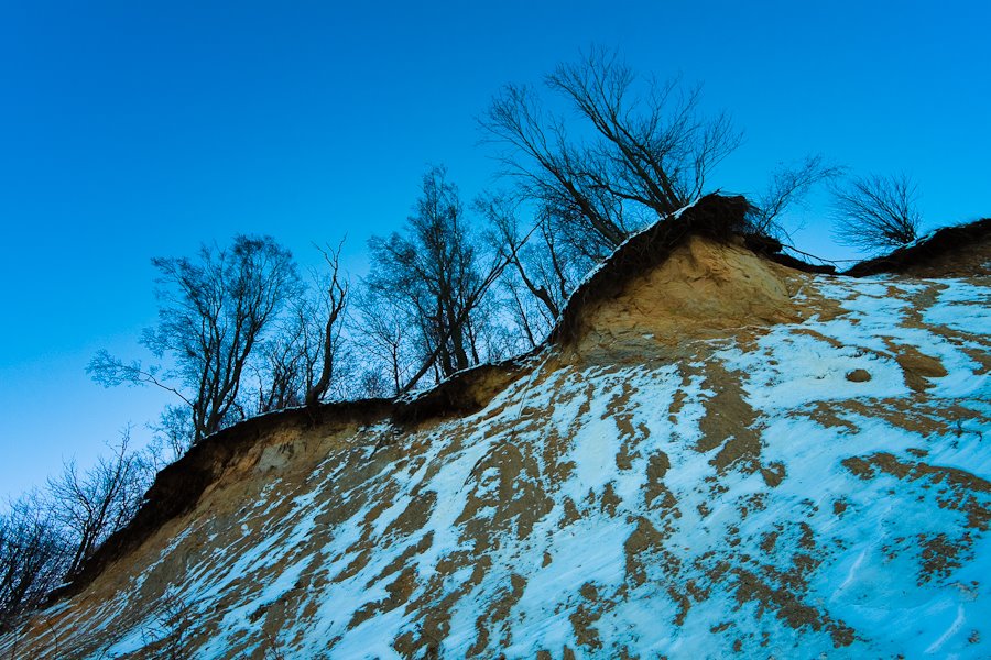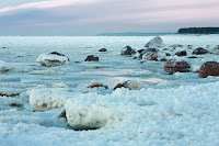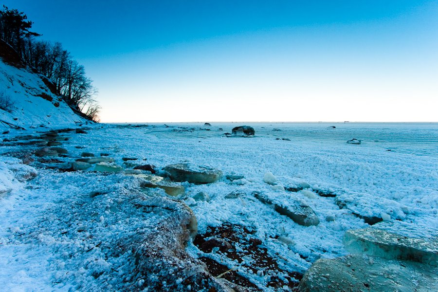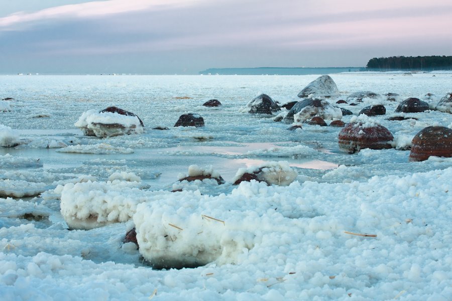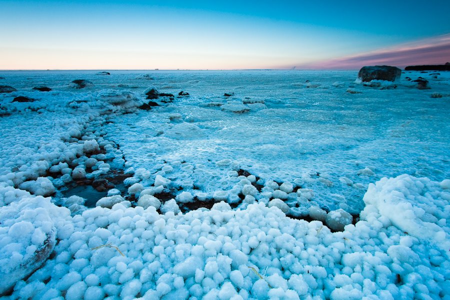 Никогда не думал, что лёд на заливе может выглядеть настолько сюрреалистично. Весь залив покрыт этакими “снежками” размером с кулак, и твёрдыми, как лёд. У берега было до полуметра такого поп-корна. Оказывается, в снежный шторм на волнах снег сбивался в комья, которые плавали, и к которым прилипал новый снег. Вся поверхность воды была забита такими штуками. Потом всё замёрзло, а вокруг снежков образовались маленькие ледяные «юбочки».