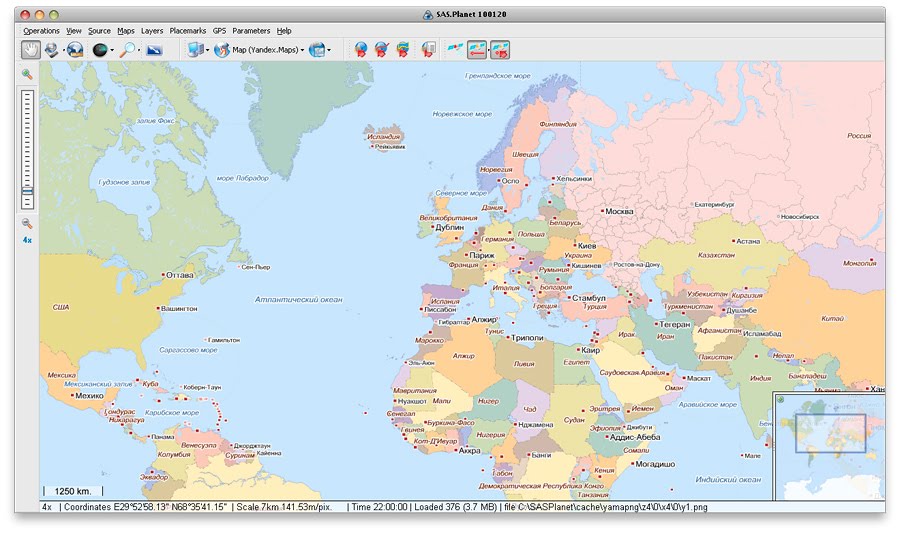 Работать с картами мы будем в приложении SAS.Planet. Это windows-программа, и, к сожалению, Mac-версия отсутствует (и вряд ли будет). Однако SAS.Planet превосходно работает как в Crossover (Mac-эмулятор окружения Windows), так и в Windows, запущенной в виртуальной машине Parallels. Раз уж у меня сейчас запущена виртуалка, скриншоты будут из неё.