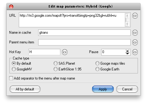 В SAS.Planet'е не предусмотрен слой транспорта, поэтому эту функциональность Вам придётся обеспечить самим. Позаимствуем для этого слой Hybrid (Google). Откройте окно Parameters > Settings, и в открывшемся окне настроек в первой же вкладке отыщите нужный нам пункт Hybrid (Google):