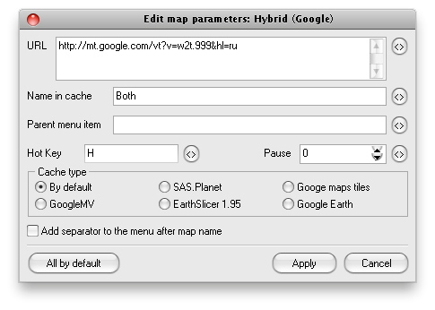 В SAS.Planet’е не предусмотрен слой транспорта, поэтому эту функциональность Вам придётся обеспечить самим. Позаимствуем для этого слой Hybrid (Google). Откройте окно Parameters > Settings, и в открывшемся окне настроек в первой же вкладке отыщите нужный нам пункт Hybrid (Google):