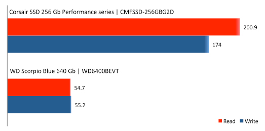 Если сравнить с прежним накопителем, Western Digital Scorpio Blue 2.5" 640 Gb, то скорости чтения/записи выше в разы, а время доступа меньше на порядки.