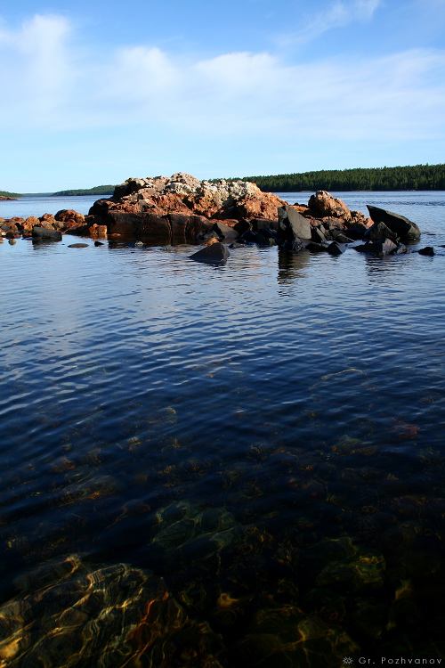 Воду здесь практически нельзя представить без камней, редко где грунт прямо подходит к воде. Самые удивительные скалы можно найти на лудах (луда — остров, не покрытый лесом). Казалось бы, всё сложено из одного и того же гранита, но цвета меняются от красно-бурого до голубоватого, фактуру поверхности вообще сложно описать. Камень подчас такой, будто человек проделывал прорези болгаркой — такие ровные и длинные трещины.