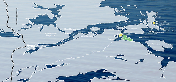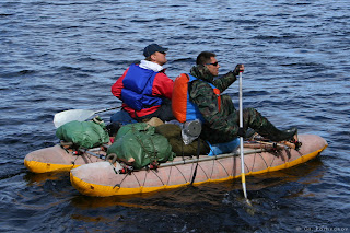 Туристы-байдарочники обходят остров МБС, направляясь к лагерю у острова Виченная Луда.