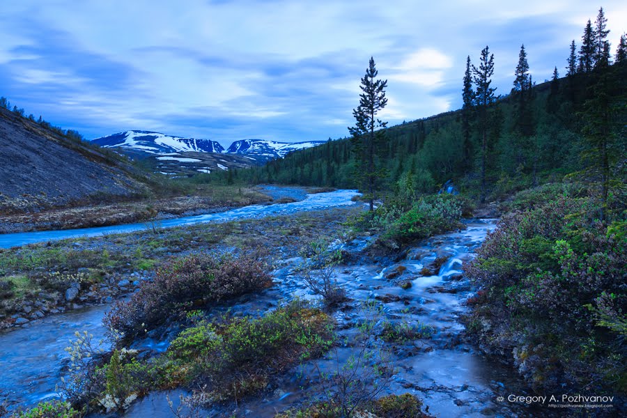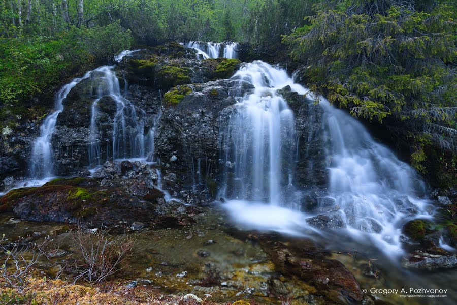 И действительно, в полярный день наиболее выигрышное время для съёмки воды – ночь. В долинах солнце напрямую не светит, оставаясь в тени гор, и освещение получается очень мягкое, рассеянное и неяркое. Разумеется, при этом удобно снимать со штатива на долгих выдержках, получая гладкий рисунок струек и потоков воды. Волшебность картины дополняется холодным светом, когда вода не жёстко-белая, как днём, а в оттенках голубого, и к тому же хвоя елей вокруг выглядит более пушисто при ночном освещении.