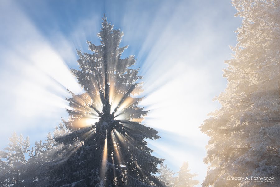 Давно хотел снять такое – лучи света пронизывают морозный туман.