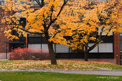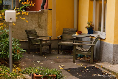 Очень нравится такое сочетание цветов и материалов в осеннем городе: жёлтая листва, стекло, кирпич, трава. Arkadiankatu, Helsinki.