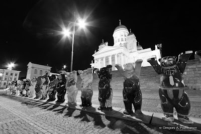 В Хельсинки привезли выставку медведов, каждый из которых представляет какую-нибудь страну мира. Наш медвед размалёван матрёшкой. Ну, хорошо хоть, бутылку водки в лапе не держит (выпала?). Самые интересные медведы из Африки. Там мало того, что самих стран туча, так и у всех свой этногардероб различается.